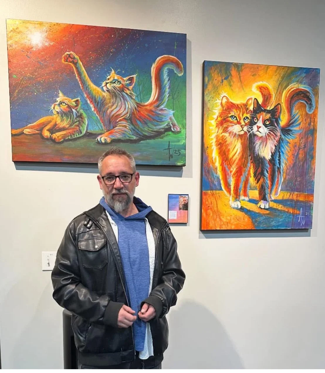 Adam Weinzapfel’s artwork at Elevated Communities Cat Café celebrates the beauty, personality, and spirit of animals. As part of this great nonprofit, he is proud to contribute to a space that supports cat adoption and community engagement. His pieces capture the essence of feline charm, adding to the warm and welcoming atmosphere of the café.