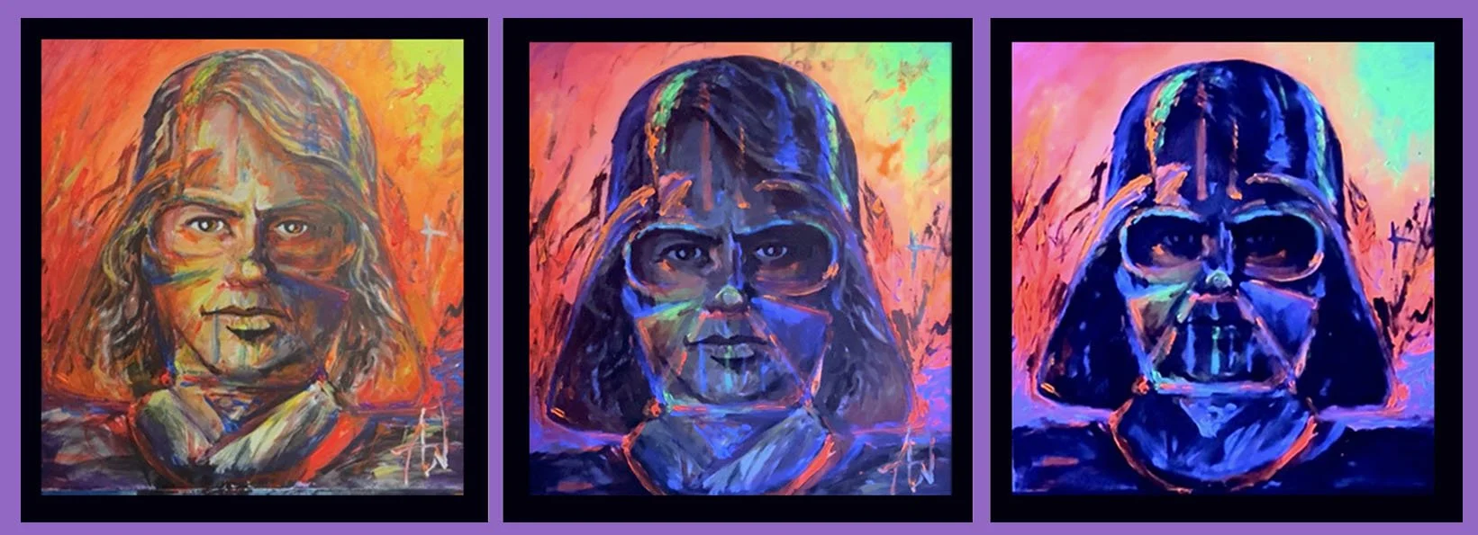 explores the inner battle between who we are and who we fear we might become. Each painting embodies iconic oppositions—hero and villain, alter ego and nemesis, light and shadow—contained within a single figure. Created using a combination of traditional acrylics and fluorescent paint, the works reveal dual images through shifts in lighting. Under black light, one glowing identity emerges; with the sweep of a simple beam of light, another version is unmasked. This transformation exposes the fragile line between opposing selves, where heroes become villains and hidden identities are revealed.